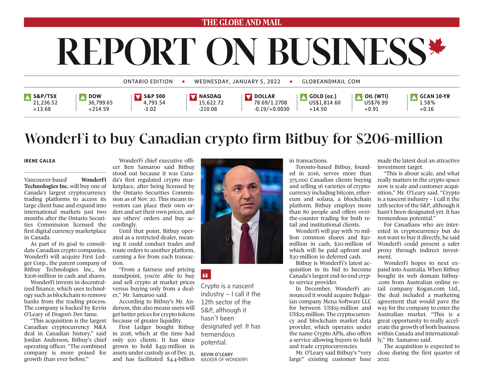 The Globe and Mail: "WonderFi to buy Canadian crypto firm Bitbuy for $206-million"